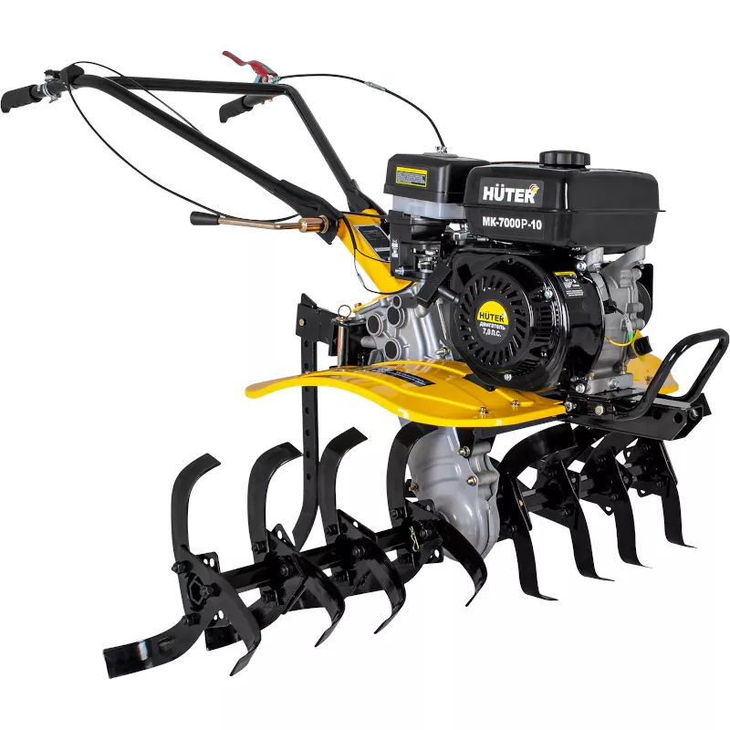 Сельскохозяйственная машина HUTER МК-7000Р-10 поставляется с большими колесами, диаметр которых составляет 10 см. Благодаря этому устройство не будет проваливаться в рыхлый грунт.