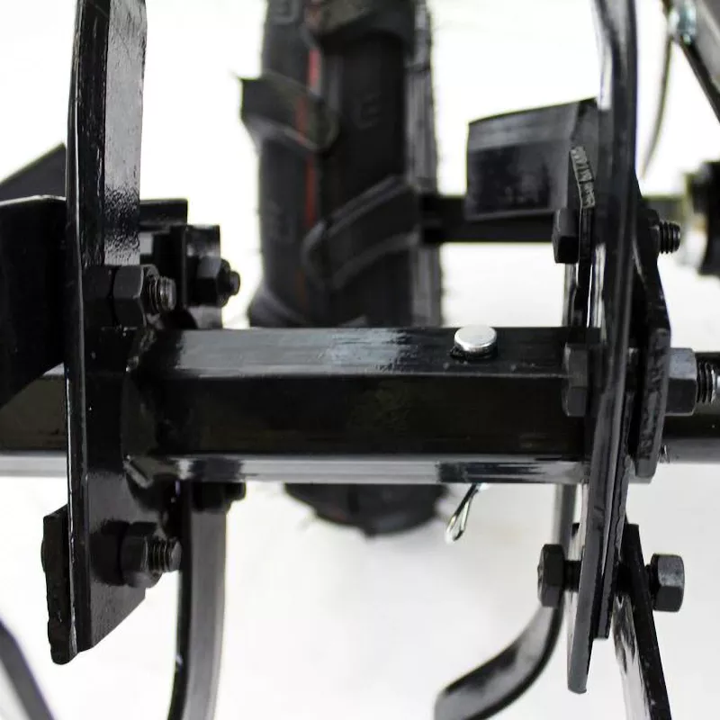 Привод с валом отбора мощности позволяет подключить к мотоблоку подвижную оснастку, например газонокосилку, сеялку или снегоуборщик. Аппарат совместим с инструментами разных производителей с посадочным отверстием 14 мм. Для вспахивания земли съемные фрезы дают возможность настроить ширину захвата до 1 м.