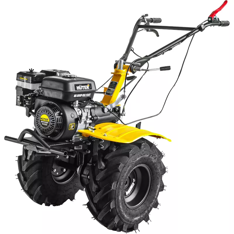 Мотоблок Huter МК-8000P BIG FOOT оснащена шестигранной ступицей на 23 мм, которая дает возможность использовать грунтозацепы и большие колеса. Благодаря глубокому протектору шин машина без труда проходит вязкую и рыхлую землю, не застревая в ней. Чугунный корпус редуктора защищает механизм от повреждений при наезде на твердые препятствия.