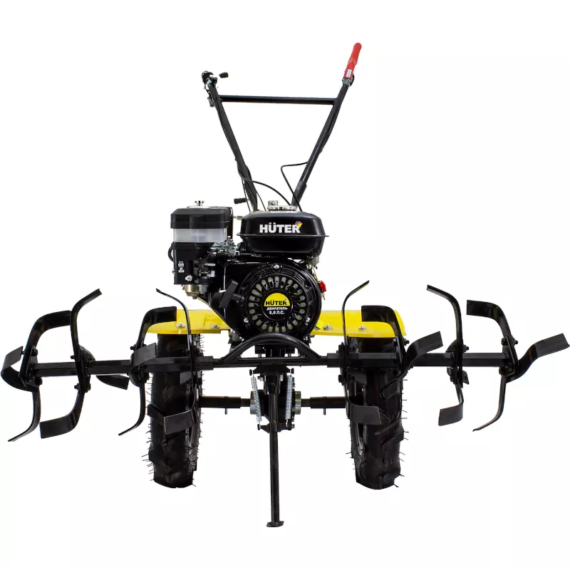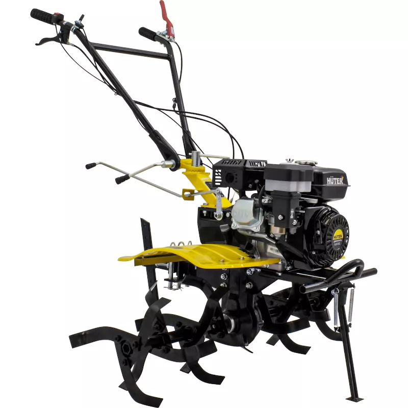 Сельскохозяйственная машина Huter MK-8000PВ полностью контролируется с рабочего места. На удобных прорезиненных рукоятках расположены все основные органы управления: тумблер газа, кнопка запуска двигателя, а также переключатели заднего и переднего хода. Режущий механизм приводится в действие только при зажатых рычагах сцепления, благодаря чему исключается непроизвольное движение машины.