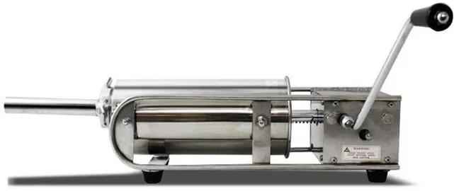 Шприц колбасный Hualian Machinery TG-5L предназначен для приготовления колбас, сосисок, сарделек и шпикачек. Отличный выбор для небольших производств, ритейла, ресторанов и даже для домашнего использования.Принцип работы достаточно прост: сырье загружается в бункер, вращением маховика масса проталкивается к цевке и выходит уже непосредственно в оболочку. Таким образом, оператор может контролировать скорость и объем наполнения. Консистенция и структура фарша может быть самой разнообразной, вместе с аппаратом поставляется комплект сменных цевок – под оболочку различного диаметра.