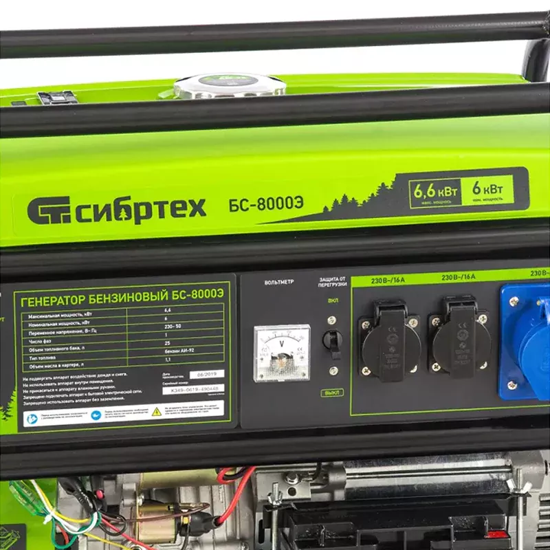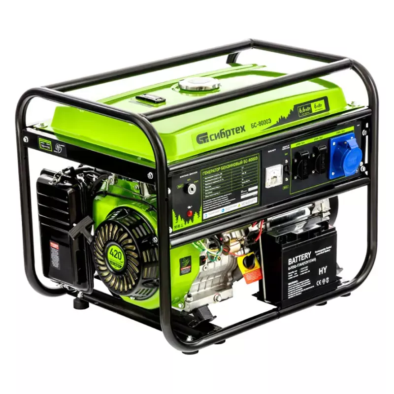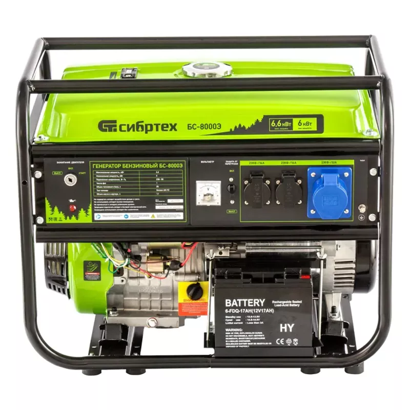 Бензиновый генератор Сибртех БС-8000Э подходит для резервного энергоснабжения частного дома, дачи, торговой точки, позволяет пользоваться электричеством во время рыбалки, отдыха на природе, выездных строительных работ. Генератор снабжен двумя бытовыми розетками 230 В/16 А и одной силовой 230 В/32 А, которые закрыты крышками от попадания влаги и пыли. Передвижная электростанция с максимальной мощностью на выходе 6,6 кВт позволяет пользоваться сразу несколькими электроинструментами, осветительными приборами, телевизором, электроплитой, холодильником и другой техникой даже при отсутствии напряжения в сети.