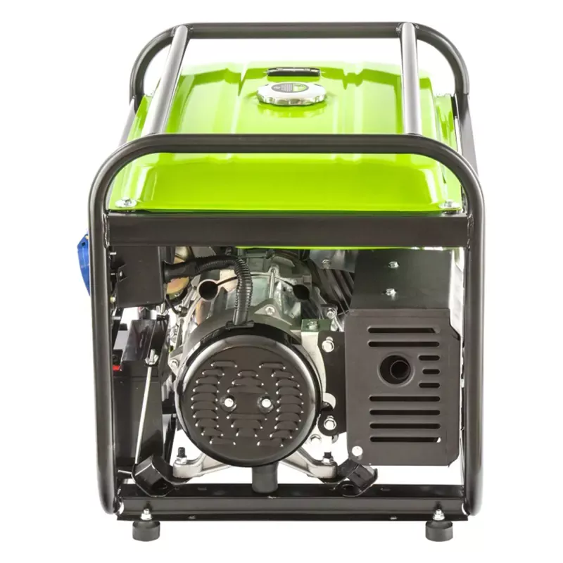 Открытая металлическая рама огибает весь корпус, защищая внутренние узлы от механических повреждений. Ее нижняя часть служит опорой, а верхняя — держателем для переноски электрогенератора. Амортизаторы гасят вибрацию и повышают устойчивость генератора.