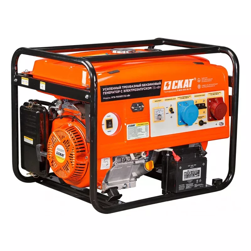 Трехфазный бензиновый генератор СКАТ УГБ-7500ЕT мощностью 7,5 кВт на 380 вольт и 7,5 кВт на 220 вольт представляет собой мобильное оборудование как для бытового, так и для профессионального использования. Служит источником питания различных приборов, когда нет возможности подключится к электросети.