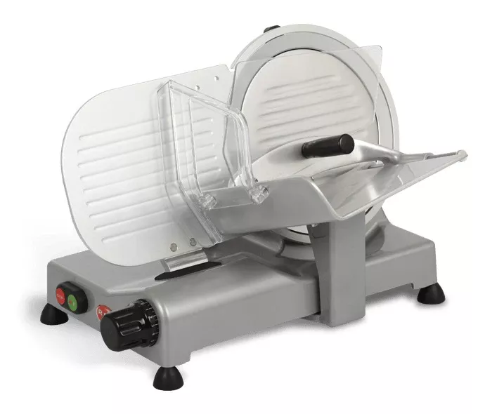 Слайсер полуавтоматический с наклонным ножом для нарезания гастрономических продуктов.