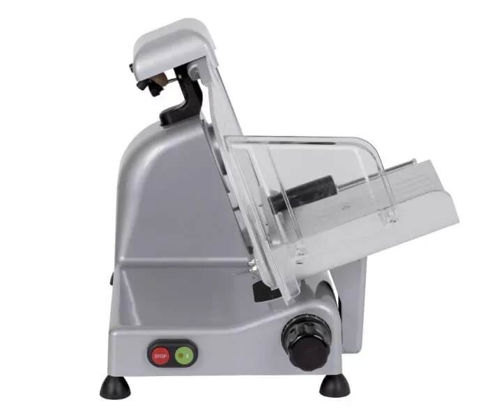 Слайсер полуавтоматический с наклонным ножом для нарезания гастрономических продуктов.