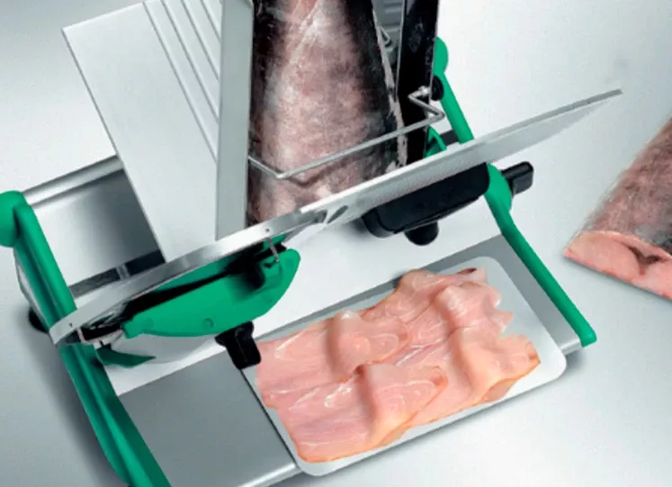 Слайсер Rheninghaus Prima 300 для рыбы используется на предприятиях общественного питания и торговли для нарезки рыбных стейков.