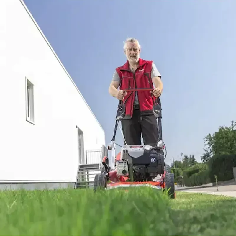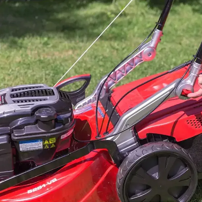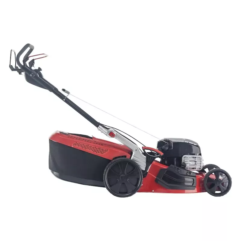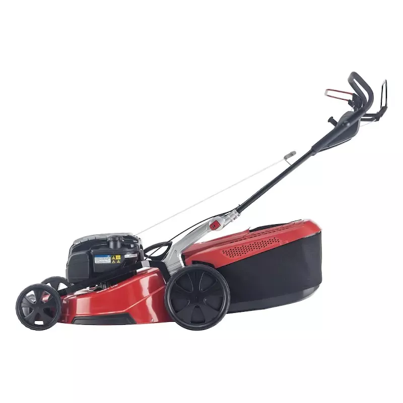 В передней части бензиновой газонокосилки расположена транспортировочная ручка. За неё удобно приподнимать модель от земли. Например, чтобы перенести через бордюр или ступеньки.