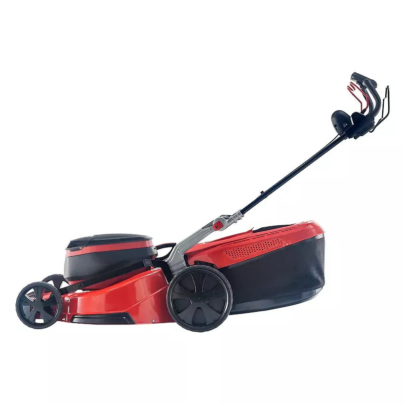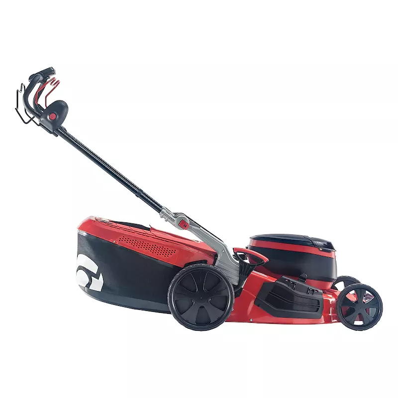 Элементы управления вынесены на прорезиненную рукоятку удобной формы, которую после работы легко сложить для хранения и транспортировки. В передней части корпуса предусмотрена ручка для переноски. Большие колеса размера XXL выполнены из мягкого пластика, имеют глубокий протектор, шарикоподшипники, разный диаметр передней и задней пары для плавного хода, проходимости по высокой траве.