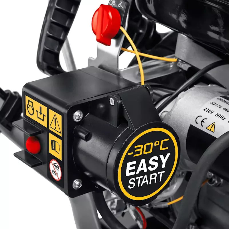 Бензиновый снегоуборщик оснащен электростартером, который работает от сети 230 В и помогает с легкостью завести двигатель даже в сильный мороз. Благодаря трансмиссии с фрикционным диском вы легко подберете удобный темп передвижения в зависимости от высоты и плотности снега, а две скорости заднего хода повысят маневренность, облегчат разворот и парковку. Двухступенчатая система с мощными шнеками справится как со свежевыпавшим снегом, так и с настом. Колеса диаметром 14" с глубоким протектором обеспечивают хорошее сцепление с поверхностью, не пробуксовывают в сугробах и не проскальзывают в гололедицу.