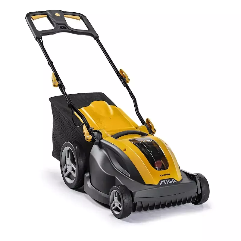 Аккумуляторная газонокосилка Stiga COMBI 344e Kit (1 x 5 Aч, ЗУ) оснащена бортиком для защиты от дерна, регулируемой рукояткой с мягким покрытием и эргономичным рычагом, а также специальной рукояткой для облегченного переноса. По окончании кошения просто сложите рукоятку для удобного хранения. Или, если хотите, установите рукоятку в положение «S» и повесьте газонокосилку на стену.