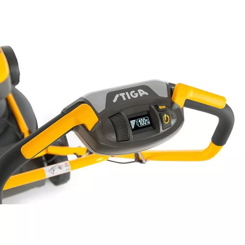 - Благодаря электронному управлению, газонокосилку не нужно толкать перед собой, что минимизирует усталость пользователя, а складная рукоятка с мягким покрытием и удобным цифровым дисплеем позволяет экономить пространство и обеспечивает максимально комфортную работу