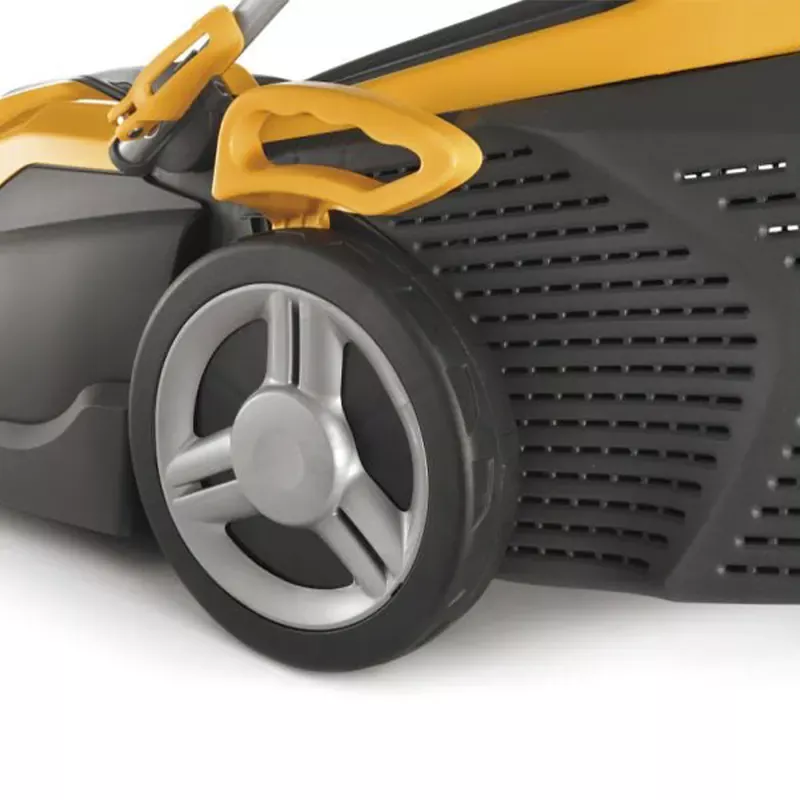 - Централизованная регулировка высоты кошения. Удобная система быстрой регулировки высоты кошения с пятью фиксированными положениями (от 27 до 80 мм) с помощью специального рычага на колесе.