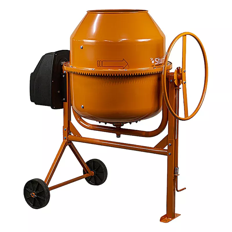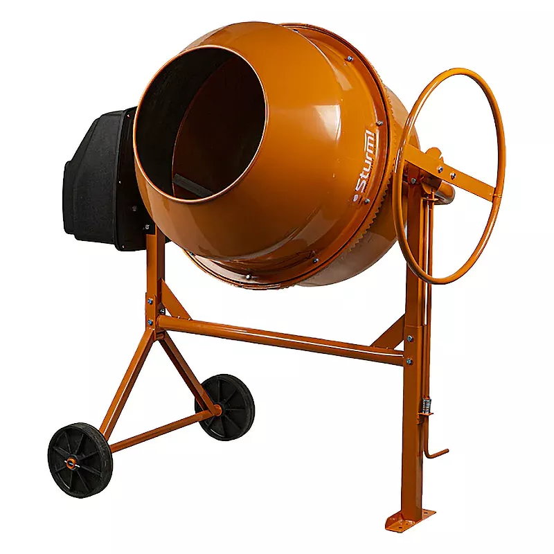 Бетономешалка обеспечивает быстрое приготовление смеси в течение 2 минут после загрузки всех компонентов. Емкость можно установить в удобном положении для хранения, перемешивания, загрузки или выгрузки. Ножная педаль фиксации барабана позволяет удерживать поворотное колесо двумя руками. Прочные транспортировочные колеса облегчают перемещение бетоносмесителя. Устройство рассчитано на замес большого объема и непрерывную работу в течение 45 минут в цикличном режиме.