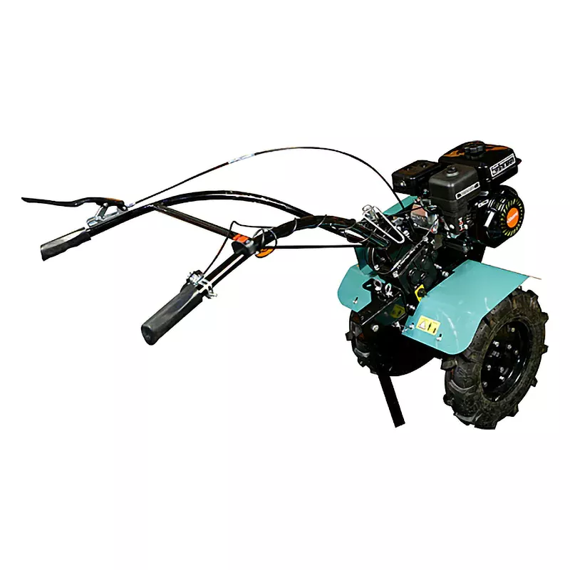 Бензиновый мотоблок оснащен четырехтактным двигателем мощностью 7 л.с. с воздушным охлаждением и ручным стартером. Руль можно регулировать в горизонтальной и вертикальной плоскости. Для удобства культивирования непаханой земли поддерживается пониженная передача на скорости 2,2 км/ч. Включение заднего хода обеспечивает маневренность мотоблока и облегчает его извлечение в случае увязывания в почве. Глубину вспашки легко регулировать путем перемещения сошника вверх-вниз. Продолжительная работа без дозаправки гарантирована благодаря вместительному топливному баку.