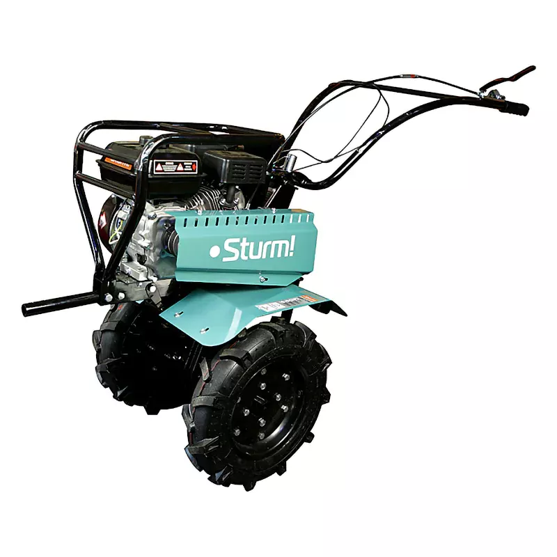 Мотоблок бензиновый Sturm! GK837CI10 — 3-х скоростная модель (понижающая, основная и повышающая) с чугунным редуктором и формованными крыльями. Удобный руль с регулировкой вверх-вниз/влево-вправо.