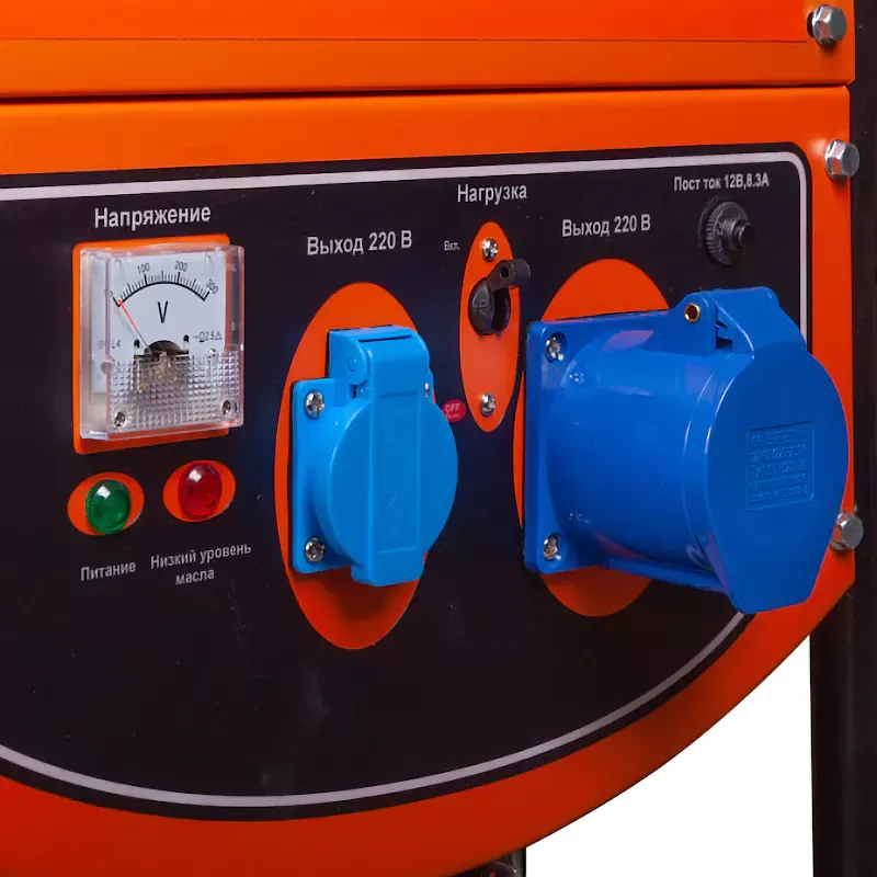 Панель управления оснащена контрольным вольтметром, двумя пыле-влагозащищенными розетками переменного тока 220В на 16А и 32А для универсального обеспечения электропитания потребителей различного класса.