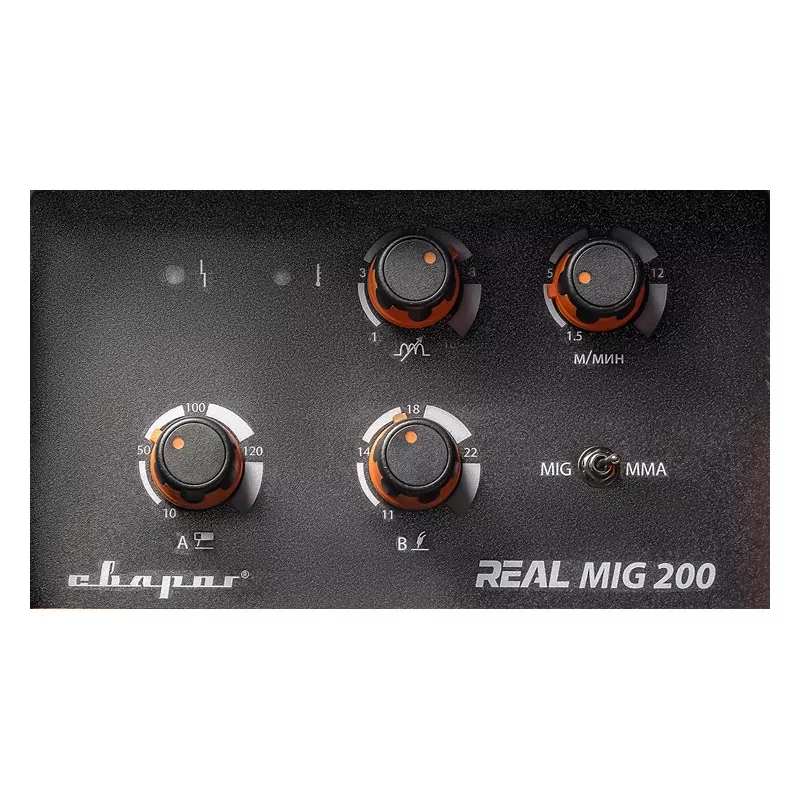 О состоянии сварочного полуавтомата Сварог REAL MIG 200 N24002N сообщают сервисные индикаторы, которые размещены на панели управления. Соответствующие лампочки загораются при перегреве, а также перегрузке по току.