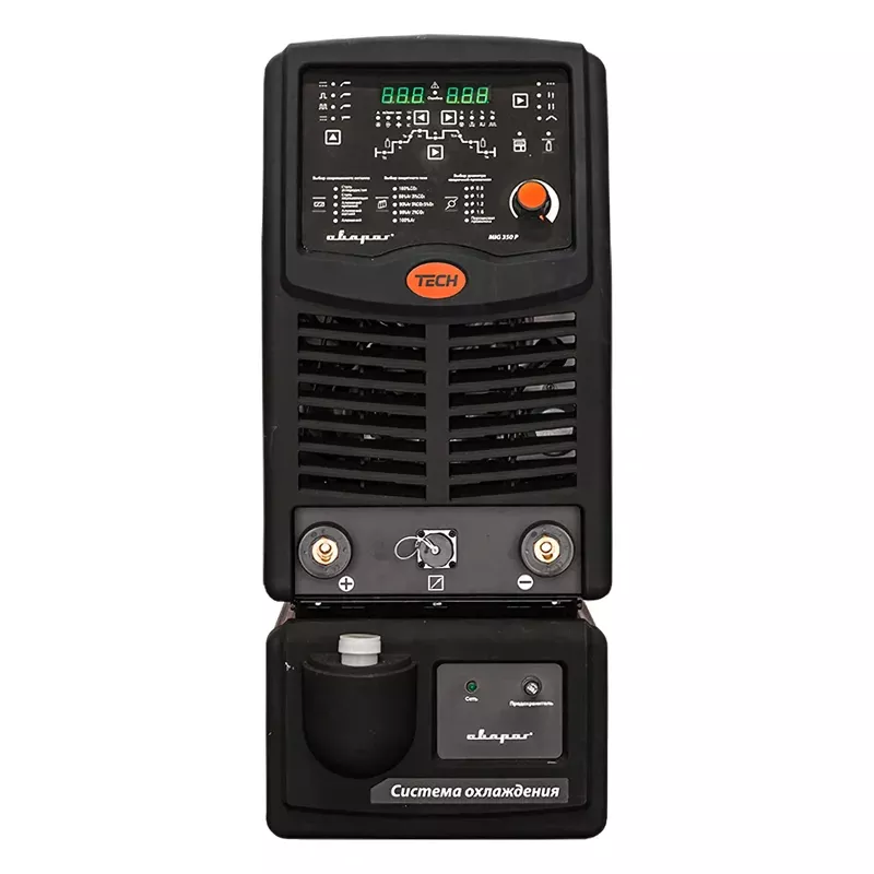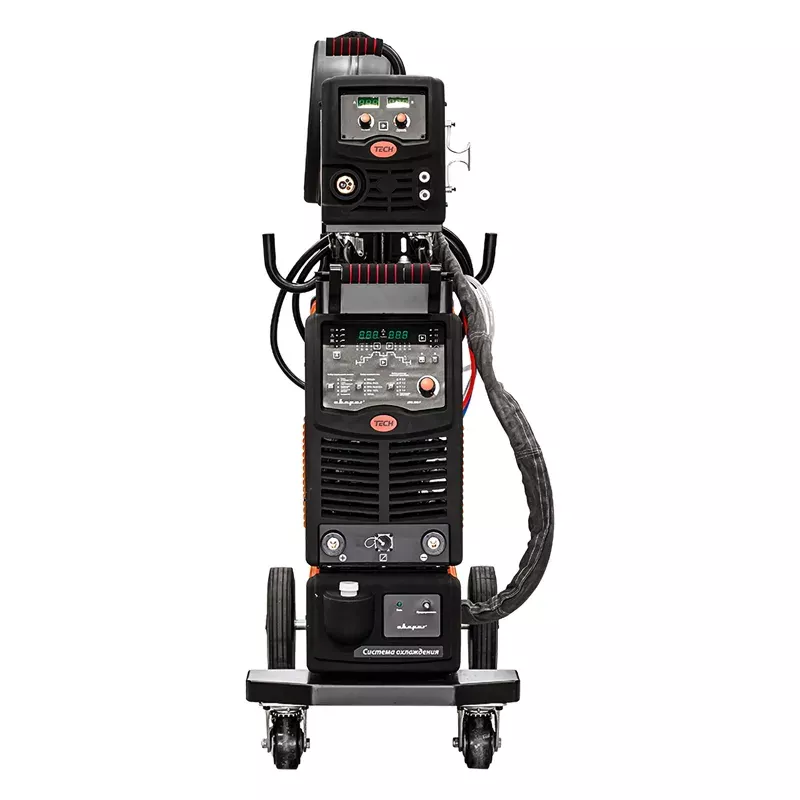 TECH MIG 350 P (N316) состоит из выносного подающего механизма, источника питания и блока жидкостного охлаждения. Все оборудование располагается на удобной тележке с площадкой для крепления баллона. Панель подающего механизма оснащена индикаторами тока и напряжения. На блоке кулера расположен индикатор уровня жидкости, а подключение блока производится без дополнительных проводов.