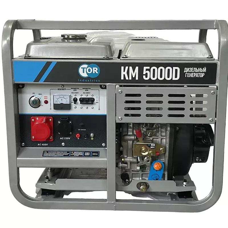 TOR KM5000D - мощный и надёжный в применении резервный источник электричества на силовой раме классической компоновки для стационарного использования. Предназначен для обеспечения резервным электричеством большинства бытовых приборов и строительных объектов как с однофазным, так и с трёхфазным подключением. Благодаря обмоткам альтернатора из 100% меди и дизельному двигателю генератор способен длительное время выдавать номинальную мощность в 5 кВт. Оборудован электрозапуском.