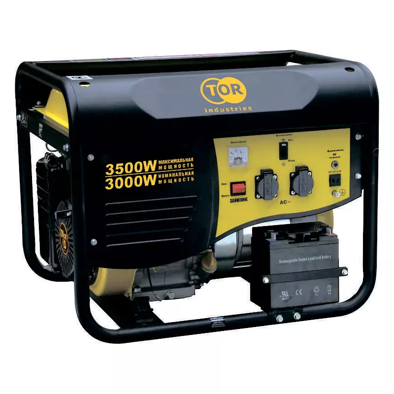 Бензиновый генератор TOR TR3500E 3,0 кВт 220 В, 15 л с кнопкой запуска используется в различных промышленных сферах, а также в быту, как источник питания. К прибору можно подключить однофазные устройства общей мощностью до 3.5 кВт. Опорная рама, на которой базируются все основные агрегаты оборудования, выполнена в виде ручек с обеих сторон для удобства транспортировки двумя людьми. Две розетки на 220 В закрыты специальными крышками для предотвращения попадания пыли и грязи. Генератор оснащен электрическим стартером с аккумулятором 7.5 Ач для быстрого запуска оборудования. В устройстве предусмотрено автоматическое отключение при низком уровне масла, что обеспечивает дополнительную безопасность при работе.