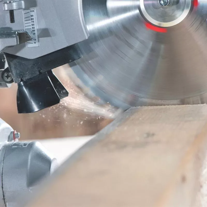 В торцовочной пиле высокие упоры сдвигаются в стороны, что обеспечивает безопасность эксплуатации.