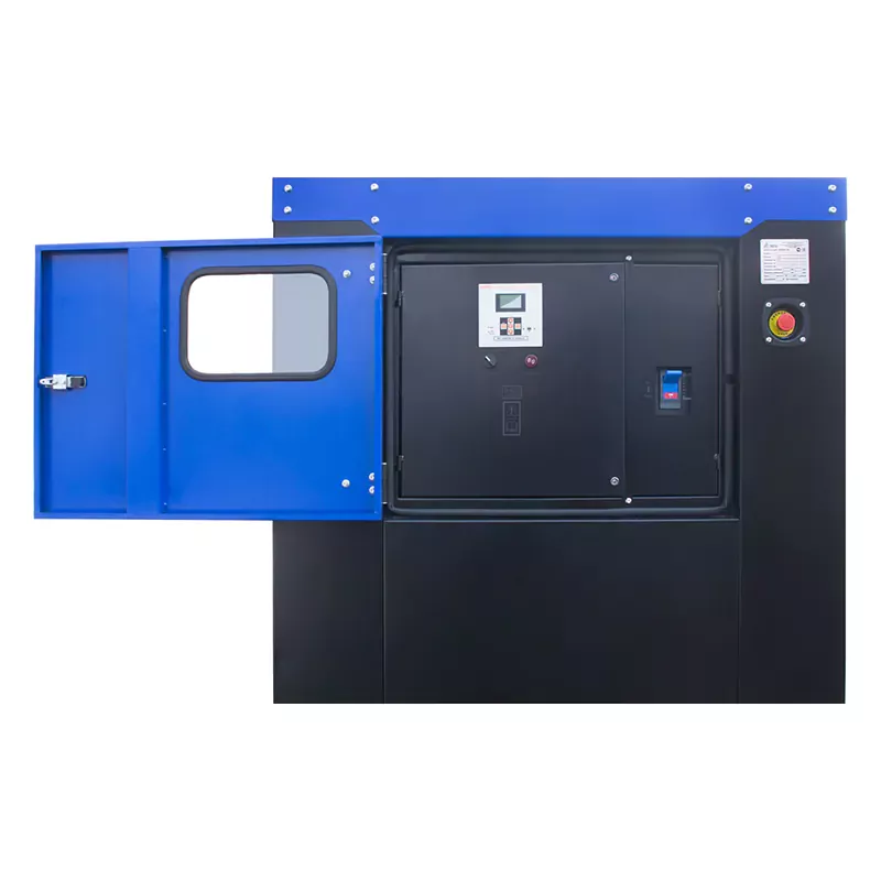 Дизель-генератор предназначен для стационарной установки в помещении или на улице. Закрытый кожух обеспечивает эффективную защиту от шума работающего двигателя и внешних неблагоприятных воздействий. Дверцы имеют отверстия для доступа к панели управления, аварийной кнопке и электростартеру для удобства обслуживания и управления. Многочисленные вентиляционные решетки обеспечивают эффективное охлаждение генераторной установки.