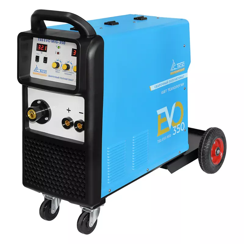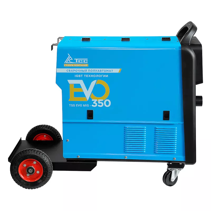 Сварочный полуавтомат ТСС EVO MIG-350 – промышленный аппарат, который поддерживает режимы ММА и MIG/MAG, выдает максимальным сварочный ток 350 А. Для простого перемещения по площадке данная модель оснащена транспортировочной тележкой с колесами и рукояткой.