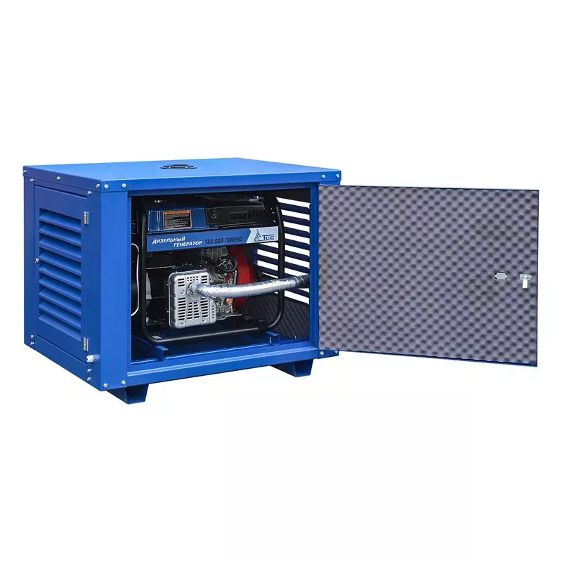 - Все внутренние повехности защищены шумозиоляционным материалом, что позволяет снизить шум генератора и использовать его вблизи жилых домов.