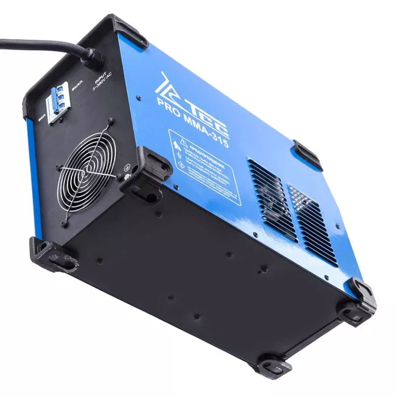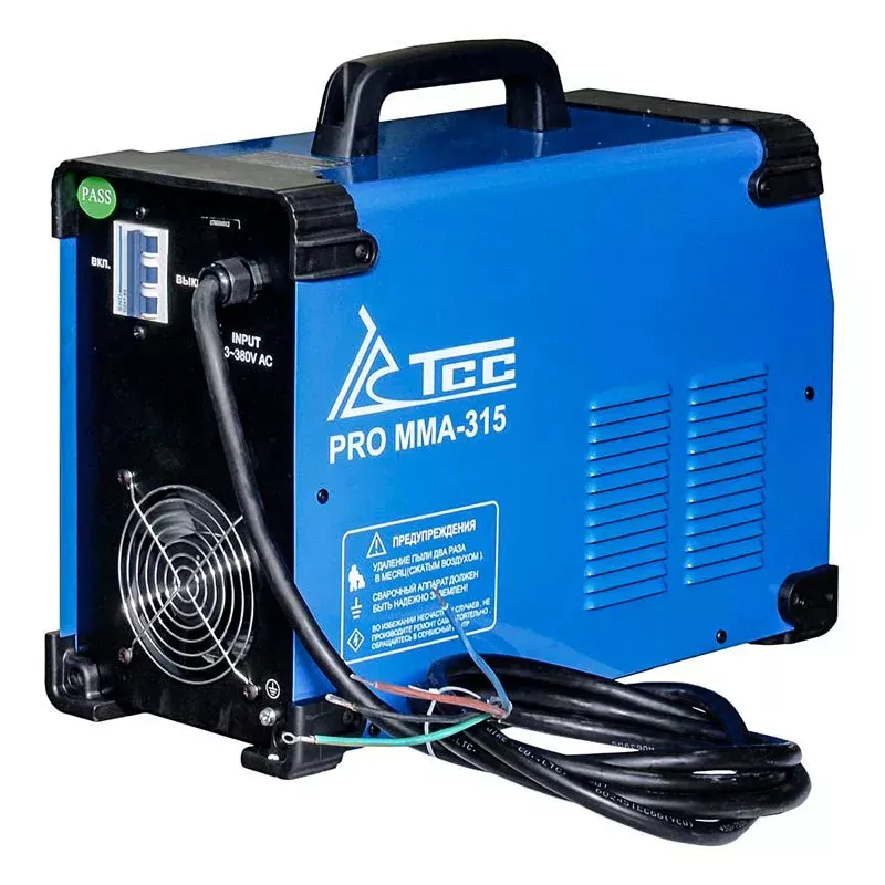Сварочный инвертор ТСС PRO MMA-315 мощностью 12,5 кВА работает от трехфазной сети с напряжением 380 В, предназначен для ручной дуговой сварки ММА штучным электродом на постоянном токе DC. Аппарат отличается простой и понятной системой настроек, подойдет для профессиональных сварщиков, но может использоваться и в быту.