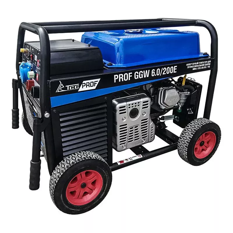 Сварочный бензиновый генератор TSS PROF GGW 5.0/200EН для профессиональных сварочных работ методом РДС и РАД. Номинальный сварочный ток 200 Ампер. Кроме этого, генератор можно использовать как автономный источник электроснабжения. Можно освещать место сварки, подключать электроинструмент - дрель, шлифмашинку, болгарку и т.п. Мощность генератора 5 кВт.
