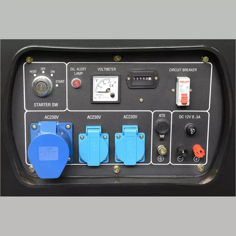 - Панель управления содержит вольтметр для отображения напряжения, счетчик моточасов, а также, индикатор уровня масла и индикатор топлива, автомат защиты.