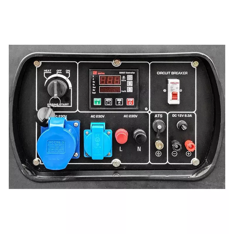 В панели управления электростанцией также установлены счетчик моточасов, для однофазных станций три розетки, одна из которых на 32А, две на 16А, выход питания постоянного тока 12 В и клемма заземления;