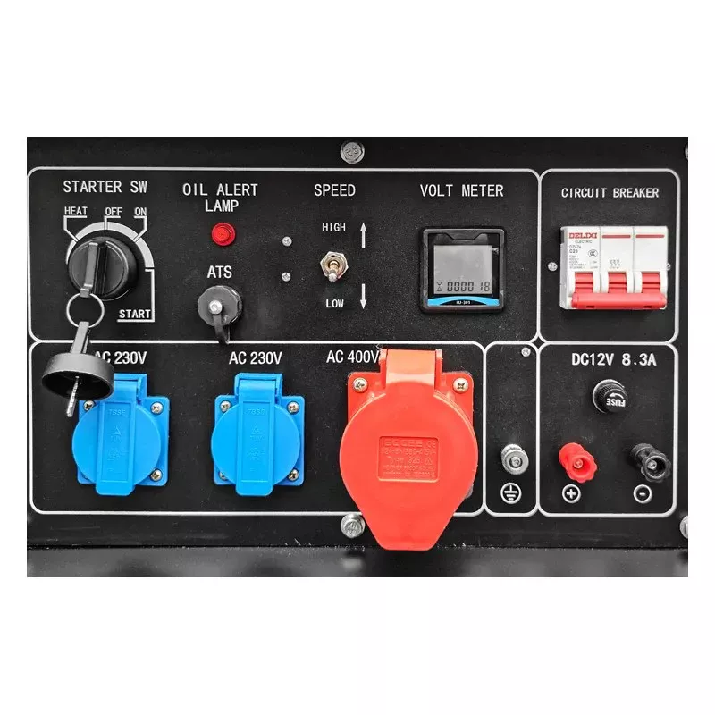 - Панель управления содержит вольтметр для отображения напряжения, счетчик моточасов, а также, индикатор уровня масла и индикатор топлива, автомат защиты