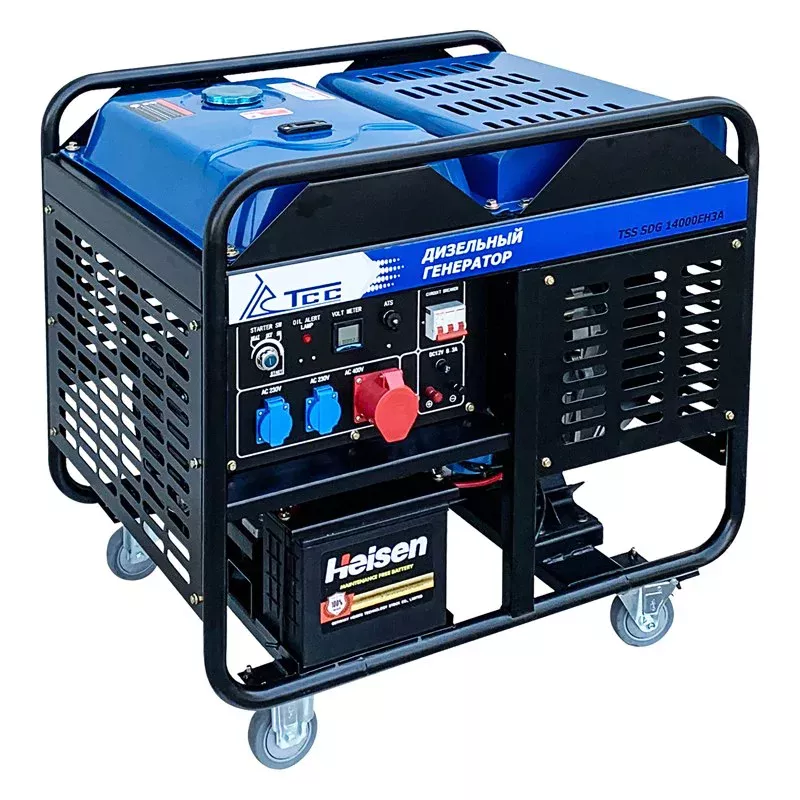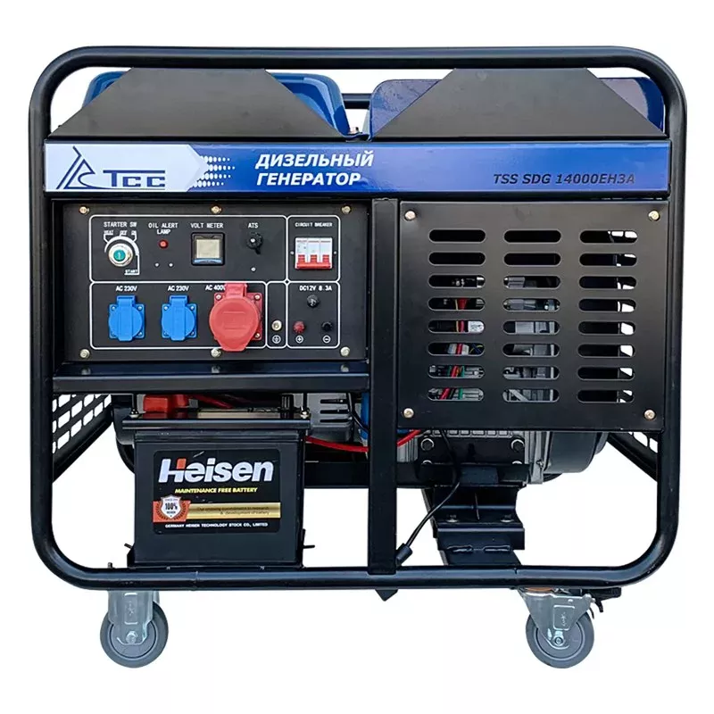Дизельный генератор TSS SDG 14000EH3A предназначен для выработки электроэнергии с основными характеристиками: напряжение 230-400 вольт, частота 50 Гц и номинальной мощностью 12 кВт, оснащенный колесным комплектом для удобства передвижения.