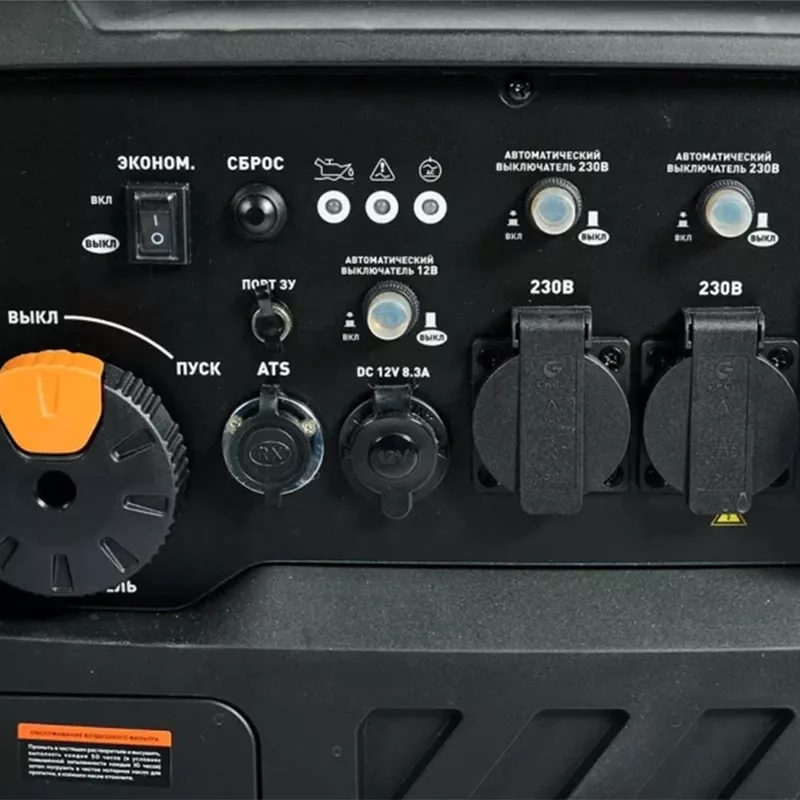 Функция экономии топлива активируется при нагрузке менее 50%, что позволяет снизить расход топлива. Дисплей «3 в 1» отображает напряжение, частоту тока и отработанные моточасы, а также имеет три светодиодных индикатора разных цветов: зеленый для переменного тока, красный для перегрузки и желтый для низкого уровня масла.