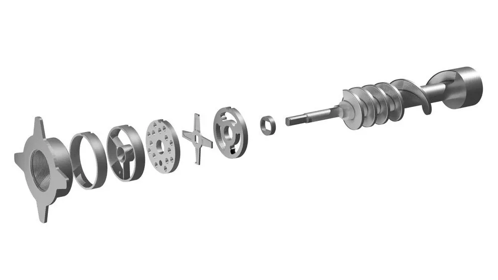 Ножевой комплект JR-D120 состоит из шнека, хвостовика, втулки крестовины, втулки решетки, крестовины, приемной решетки, четырех зубчатого ножа, решетки, упорного кольца и гайки.