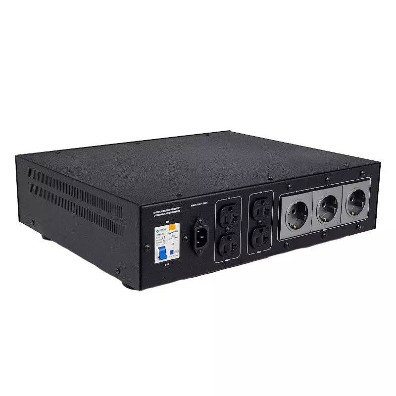Переносной стабилизатор напряжения однофазной сети для обеспечения качественным напряжением чувствительной звуковой аппаратуры с входным напряжением 100 и 120 В. Такая техника чаще всего встречается у японских и американских производителей, при этом на задней панели так же есть стандартные розетки под 220 В.