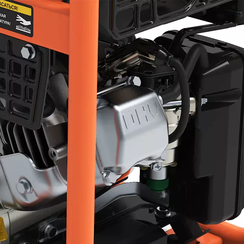 Бензиновая электростанция оснащена двигателем Zongshen GB270. Для альтернатора используется медная обмотка. Она намного прочнее алюминиевой, лучше проводит ток и медленнее нагревается. Для защиты внутренних элементов используется прочная рама. Она сделана из металлической трубы, где верхняя часть используется в качестве держателей, а нижняя выступает опорой.