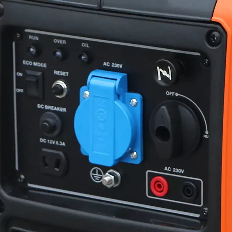 На панели управления размещена розетка 220 В. Выход защищен пластиковой крышкой, поэтому внутрь не попадет грязь, если оставить генератор на улице. Рядом расположен дополнительный разъем на 12 В, который нужен для подзарядки автомобильного аккумулятора.