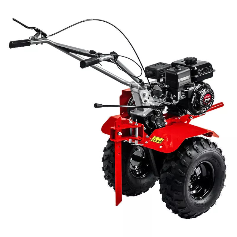 Бензиновый мотоблок оснащен четырехтактным одноцилиндровым двигателем объемом 212 см3 с воздушным охлаждением. Механический шестеренчато-цепной редуктор в чугунном корпусе с масляной ванной позволяет обрабатывать даже тяжелую почву. Крутящий момент от двигателя передает сцепление с износостойким клиновидным зубчатым ремнем. Для активного навесного оборудования предусмотрен дополнительный шкив. Объем бензобака составляет 3,6 л, а норма расхода топлива — 1,9 л/машино-час.