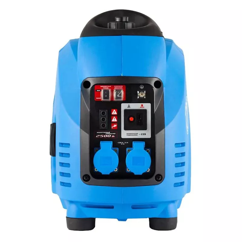 Двигатель инверторного генератора обладает максимальной мощностью 2500 Вт. Это позволяет применять устройство для питания бытовых приборов, строительных инструментов, насосов и т.д. Для подключения используются 2 розетки по 220 В и 1 гнездо с напряжением 12 В. Последнее подходит для зарядки смартфонов, планшетов, ноутбуков и другой мобильной техники.